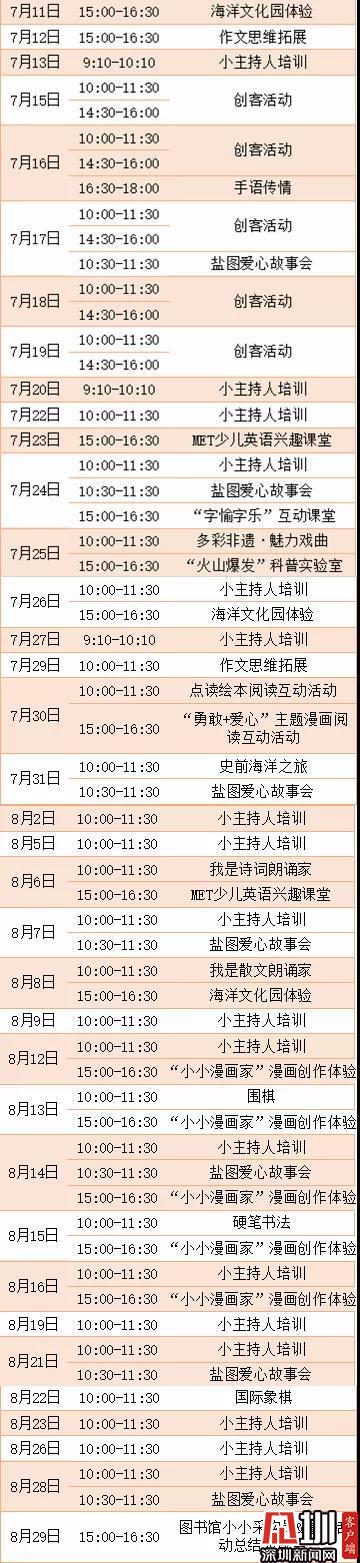 同時,7月13日—8月30日期間,區(qū)圖書館少兒館及沙頭角分館少兒服務(wù)區(qū)還適時延長了暑期服務(wù)時間,開放時間為每周一到周五的10:00—18:00,周末的09:00—18:00。來來來,鹽田的孩子們,玩樂之余也別忘記學(xué)習(xí)哦,到圖書館來趟書香之旅吧。