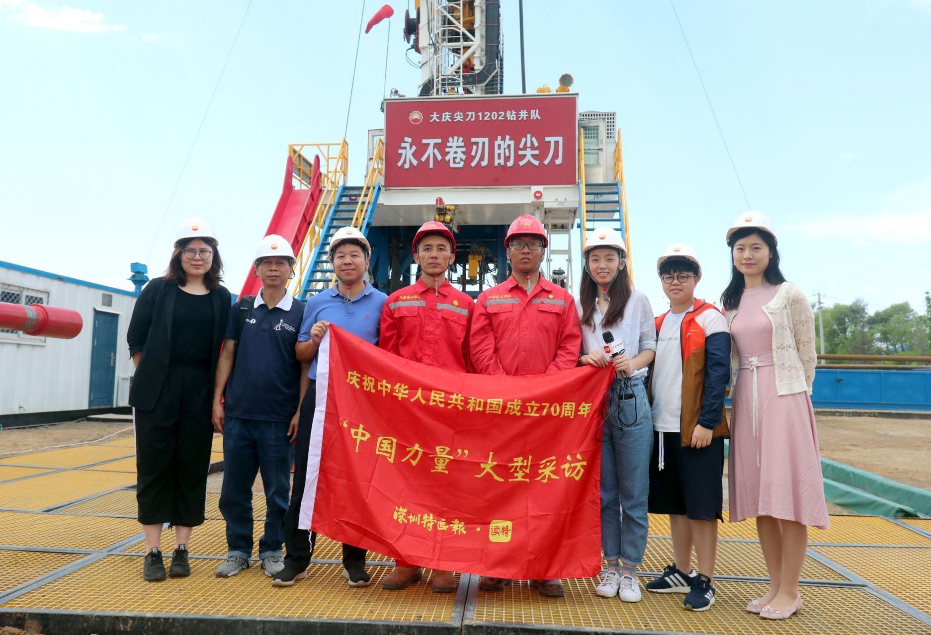 采訪組一行在1202尖刀隊(duì)鉆井臺現(xiàn)場采訪。