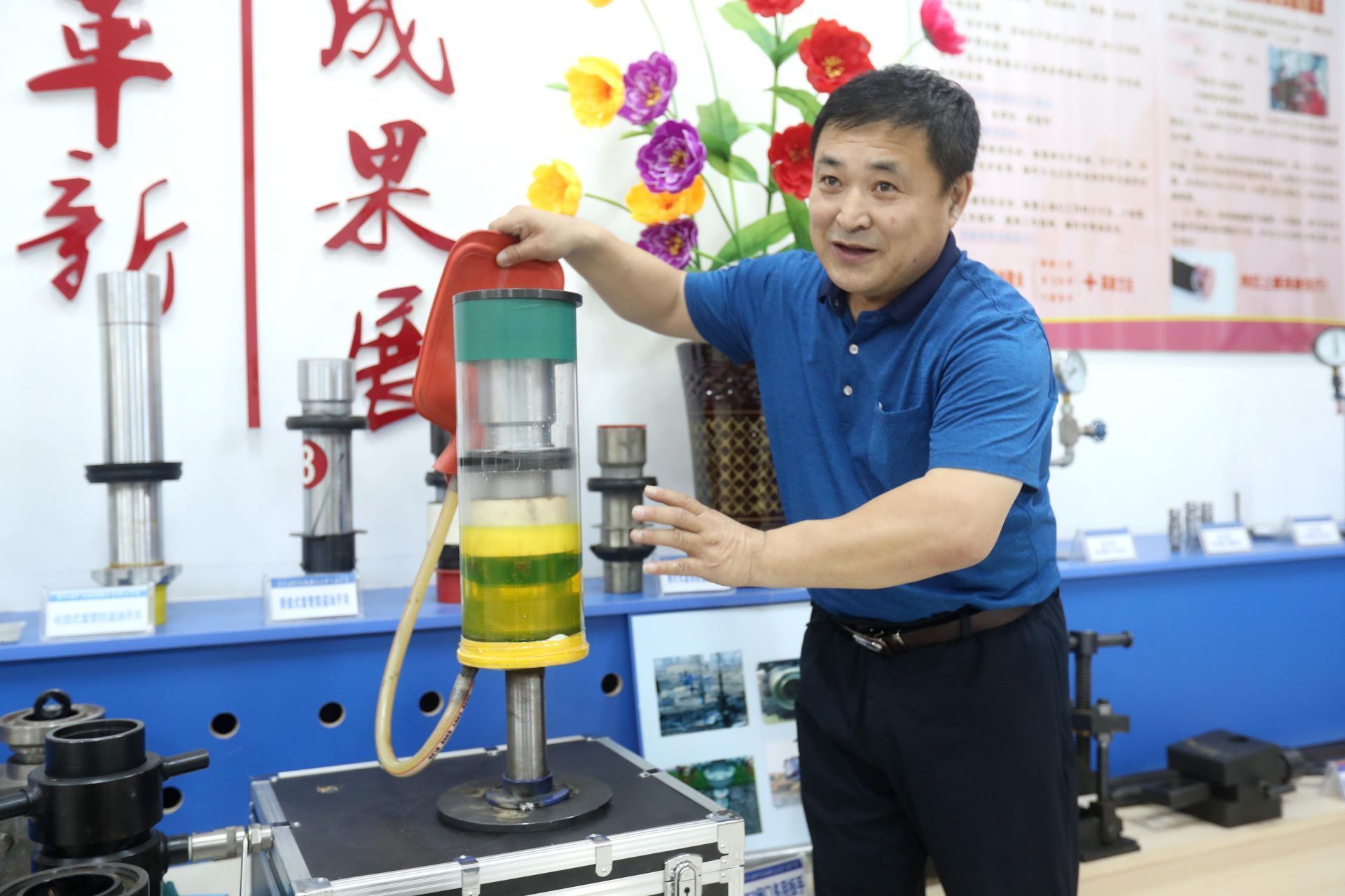在大慶油田勘探開發(fā)研究院的陳列室里,一排排試管里裝滿了水和油,不同程度的水油對比值一目了然。在試管上方,是對應(yīng)的開采巖石,油提取的越多,石頭的顏色越淺。“一次采油是靠地層自身壓力把油‘頂’出來,二次采油是向地下注水把油‘?dāng)D’出來,現(xiàn)在大慶油田采用的三次采油技術(shù),靠化學(xué)劑把油‘洗’出來?!笨碧介_發(fā)研究院采收率研究一室主任工程師曹瑞波說。