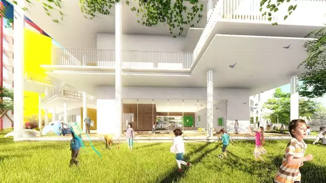 項(xiàng)目打破傳統(tǒng)整齊排列的布局方式,打造出4個(gè)與邊界呼應(yīng)的靈活體塊,在保證幼兒園首層活動(dòng)空間完整最大化的同時(shí),將新舊校舍結(jié)合,打造一個(gè)聯(lián)通式共享庭院。新建校舍為每一個(gè)班級(jí)都提供了專屬的室內(nèi)外無(wú)邊界活動(dòng)空間。除首層班級(jí)與室外活動(dòng)空間直接連通以外,二、三層班級(jí)外設(shè)有錯(cuò)落的活動(dòng)露臺(tái)及挑檐,實(shí)現(xiàn)每層均可嬉戲、游樂、探索的布局。