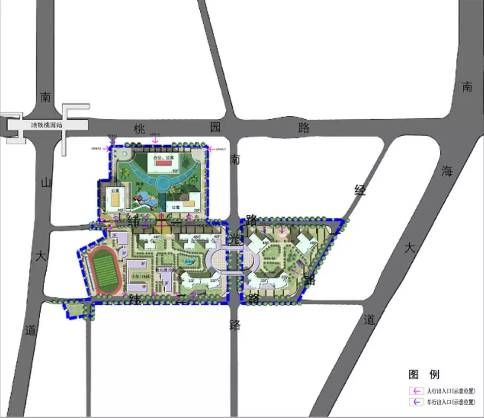 該規(guī)劃區(qū)緊臨深圳大學,處于桃園路南側,是南山區(qū)行政文體中心、高新技術人才創(chuàng)業(yè)基地的配套服務區(qū)。項目拆除用地面積為79449.5平方米,開發(fā)建設用地面積為55966.4平方米,計入容積率建筑面積448965平方米,其中,住宅220175平方米(包括33026平方米的保障性住房),商業(yè)33560平方米,辦公50000平方米,商務公寓140000平方米,配套設施5230平方米。