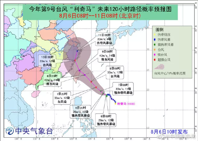預(yù)計(jì),“利奇馬”將以每小時(shí)5公里左右的速度緩慢向西北方向移動(dòng),強(qiáng)度逐漸增強(qiáng),最強(qiáng)可達(dá)臺風(fēng)級或強(qiáng)臺風(fēng)級(12-14級,35-45米/秒),逐漸向我國東南沿??拷?。未來兩天對我國近海海域無影響。