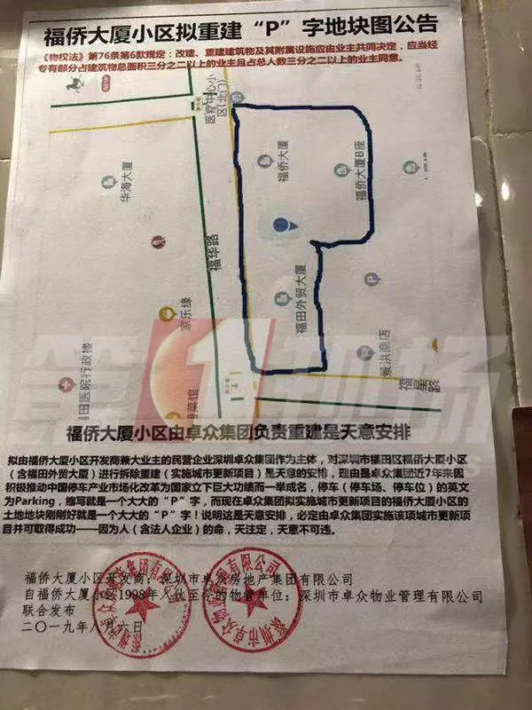 在福僑大廈小區(qū)公告欄里,出現(xiàn)了一張小區(qū)擬重建“p”字地塊圖的公告,落款為深圳市卓眾房地產(chǎn)集團(tuán)有限公司,擬重建的地塊包括福僑大廈A、B座和福田外貿(mào)大廈,文中寫道,福僑大廈由卓眾房地產(chǎn)集團(tuán)負(fù)責(zé)重建是天意安排。