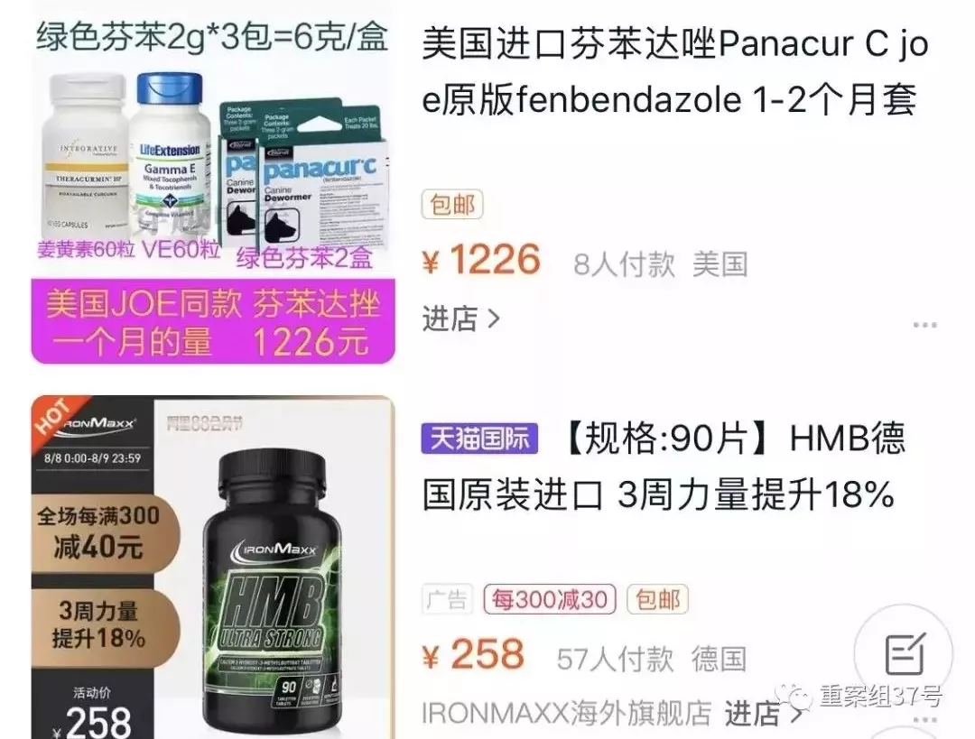 事情發(fā)展到現(xiàn)在,已經(jīng)有人在網(wǎng)上做起這門生意。在電商平臺搜索可見,不少商家打出“喬伊套餐”等招牌售賣芬苯達唑,自稱是按美國患者喬的配方搭配,但如此一來,原本20多元一瓶的藥,搭配后就要賣800元左右。