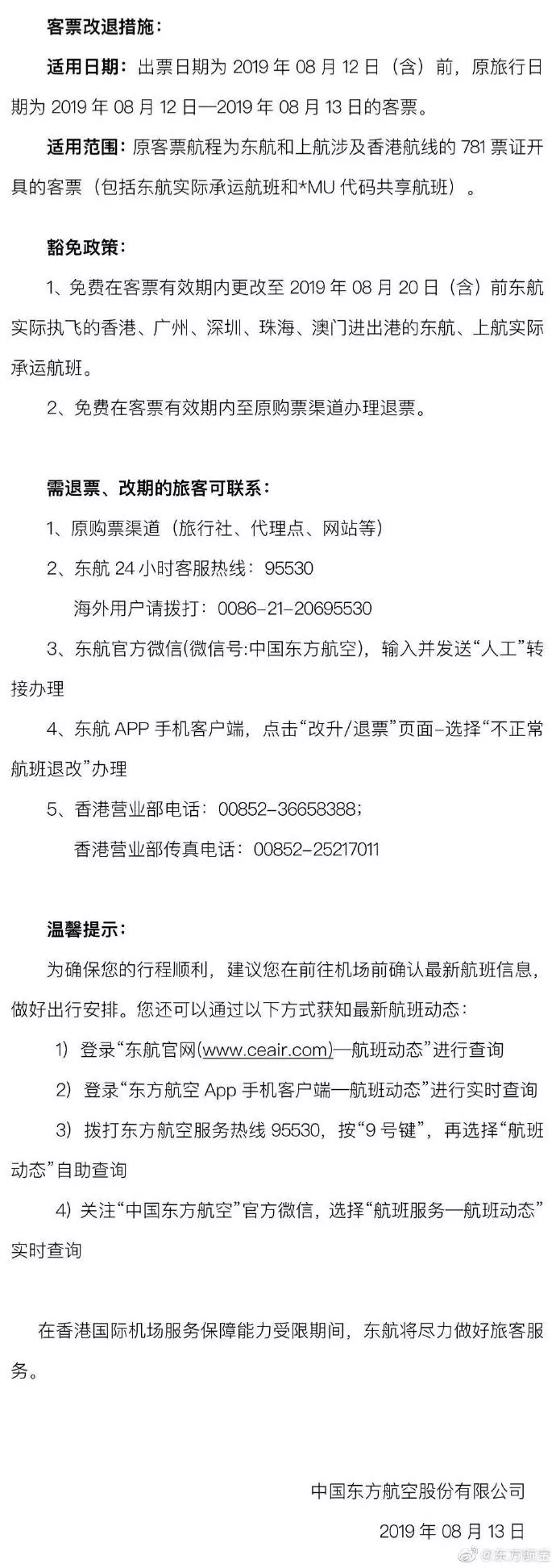 今晨,東方航空官方微博發(fā)布通告稱,受香港國際機(jī)場服務(wù)保障能力限制持續(xù)影響,東航繼續(xù)取消8月13日期間部分香港進(jìn)出港航班10班,后續(xù)東航將根據(jù)香港國際機(jī)場運(yùn)行保障情況,動態(tài)調(diào)整航班。目前取消航班信息如下圖: