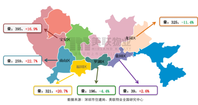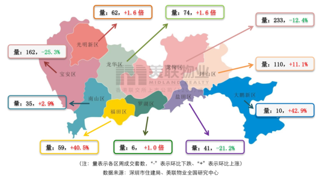 各區(qū)具體成交量及環(huán)比增減幅度差異明顯。其中龍崗成交233套,雖環(huán)比下降12.4%,但總量仍居全市首位;寶安成交162套,位居全市第二位,成交量環(huán)比下降25.3%。此外,龍華和光明并列成為上周一手住宅成交量環(huán)比上升幅度最大的區(qū)域,均增長1.6倍,分別增至74和62套。而羅湖區(qū)盡管成交套數(shù)也大幅增長達(dá)1倍,但是羅湖區(qū)新房較少,即使增長一倍也僅有6套成交。