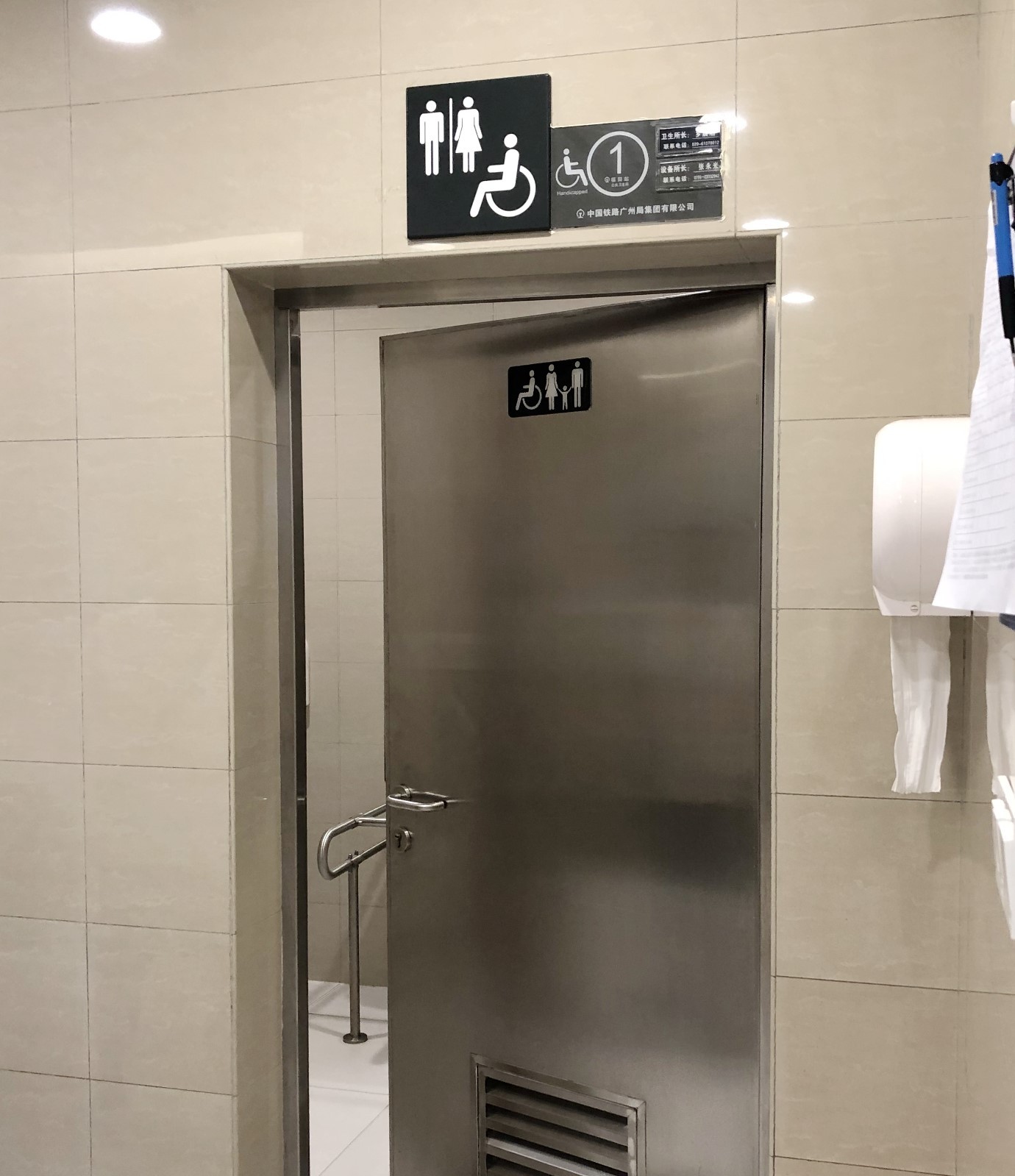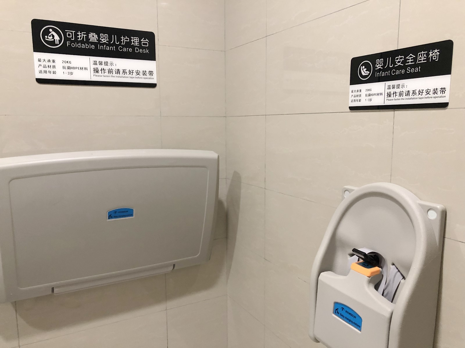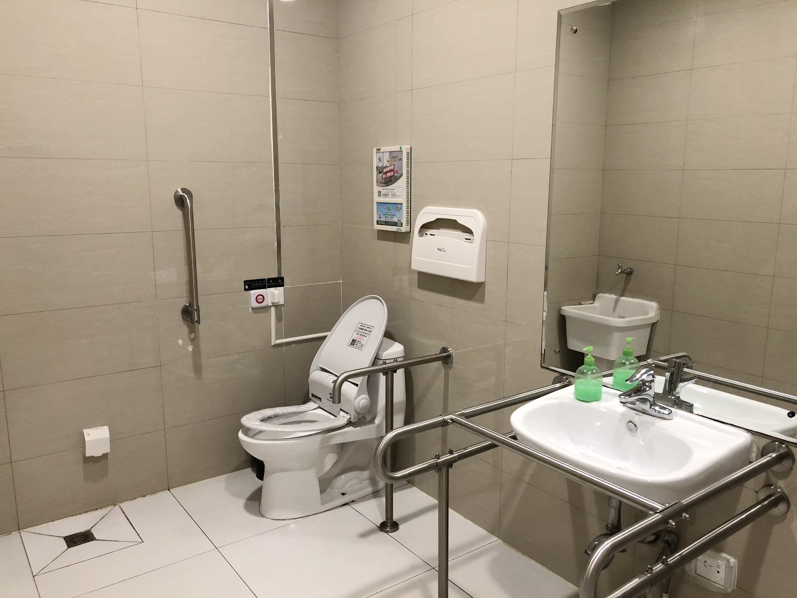 ▲在靠近福田高鐵站方向的另一處洗手間,記者在殘疾人洗手間的門上看到了第三衛(wèi)生間圖案標識。推門進入,里面除了設(shè)有帶扶手、供殘疾人使用的成人坐便器和洗手池之外,還有可折疊的嬰兒護理臺和嬰兒安全座椅,這顯然是一間將母嬰室、殘疾人洗手間“二合一”的洗手間,但沒有第三方洗手間配置所要求的兒童坐便器。