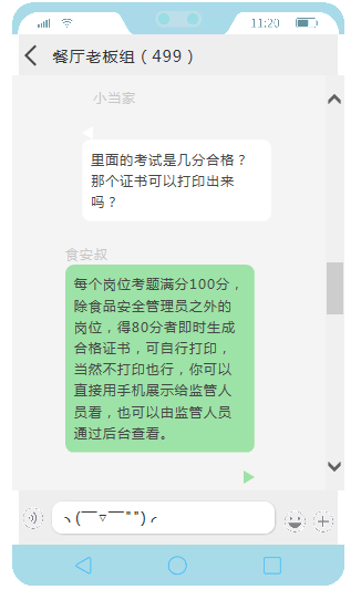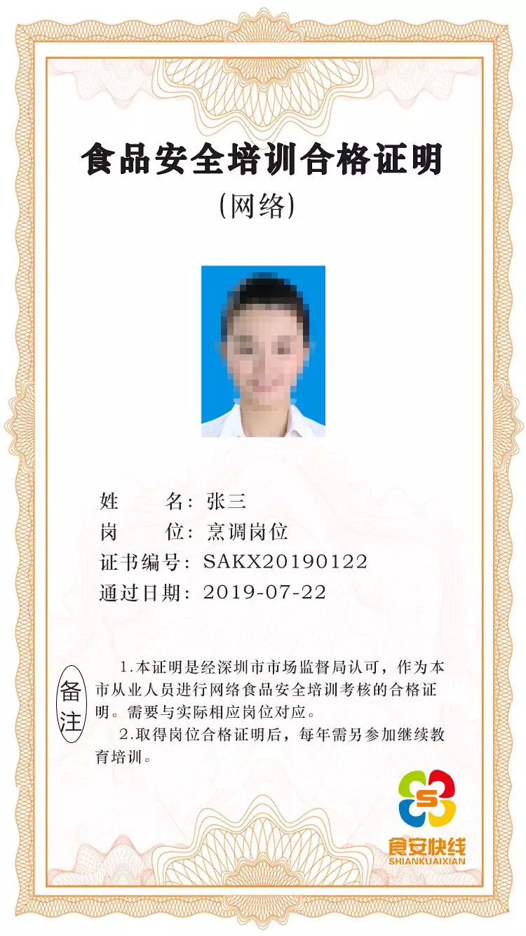 每個(gè)崗位考題滿分100分,可以重復(fù)考試,以最高分為最終結(jié)果,除食品安全管理員以外的崗位,得80分者即時(shí)生成電子合格證書,個(gè)人依據(jù)實(shí)際需要可以考取多項(xiàng)崗位合格證明。