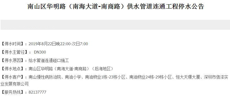 停水客戶:南山慢性病防治院、南油小學(xué)、南油物業(yè)1棟-23棟小區(qū)、南油物業(yè)24棟-29棟小區(qū)、恒大天璟大廈、深圳市信澤實(shí)業(yè)發(fā)展有限公司