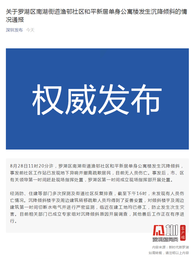 見圳客戶端.深圳新聞網(wǎng)2019年8月28日訊(見圳客戶端、深圳新聞網(wǎng)記者 張玲)8月28日11時20分許,羅湖區(qū)南湖街道漁邨社區(qū)和平新居單身公寓樓發(fā)生沉降傾斜,事發(fā)前社區(qū)工作站已發(fā)現(xiàn)地下異響并撤離疏散居民,目前無人員傷亡。目前相關(guān)部門已成立專家組對沉降傾斜原因開展調(diào)查,其他善后工作正在有序進(jìn)行。臨時疏散人員被安置到濱河小學(xué)、羅湖小學(xué)、羅湖中學(xué)高級初中部。