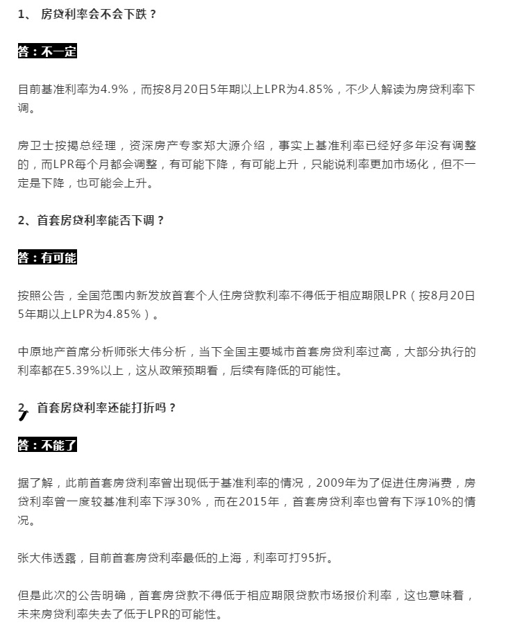 全國范圍內新發(fā)放首套個人住房貸款利率不得低于相應期限LPR(按8月20日5年期以上LPR計算為4.85%);