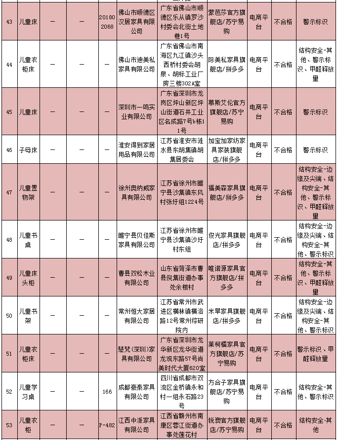 兒童家具產品質量監(jiān)督抽查不合格企業(yè)名單