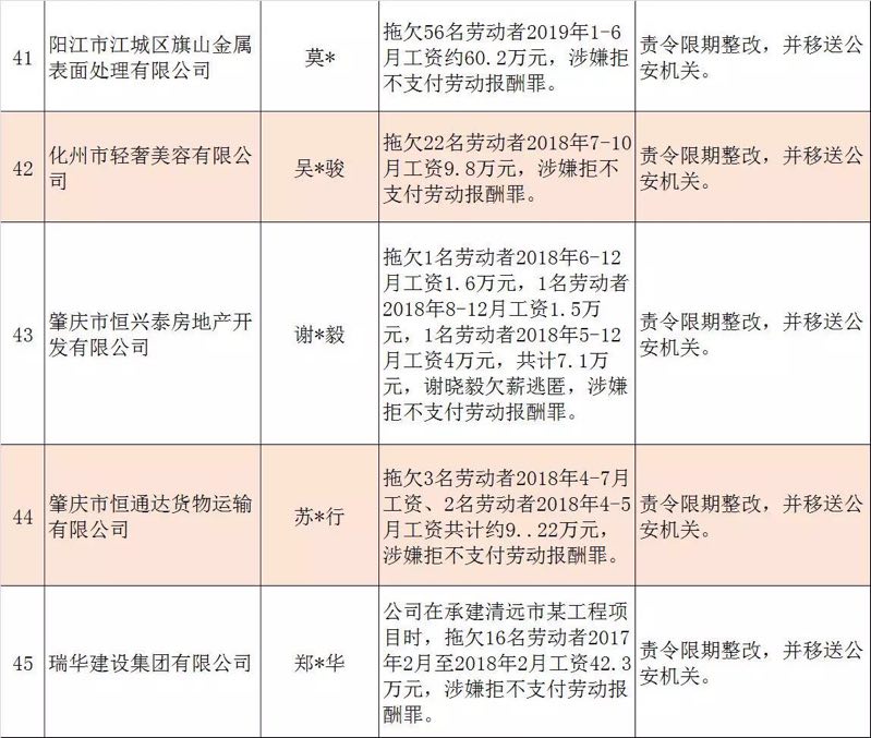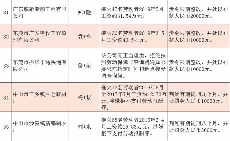 今年第二季度以來,廣東省人力資源社會(huì)保障行政部門繼續(xù)加大對(duì)欠薪等重大違法行為的打擊力度,各地特別是廣州、深圳、珠海、惠州、中山等地對(duì)欠薪逃匿、欠薪屢教不改、欠薪涉及人數(shù)和金額巨大等違法行為重拳出擊,依法處罰處理,對(duì)涉嫌犯罪的堅(jiān)決移送司法機(jī)關(guān)繩之以法,切實(shí)維護(hù)勞動(dòng)者的勞動(dòng)報(bào)酬等權(quán)益。為加強(qiáng)對(duì)違法用人單位的社會(huì)監(jiān)督,強(qiáng)化誠信體系建設(shè),加大威懾力,日前省人社廳披露了2019年第三批重大違法案件,這51家黑心企業(yè)中就有10家是深圳“揪”出來的(如圖)。
