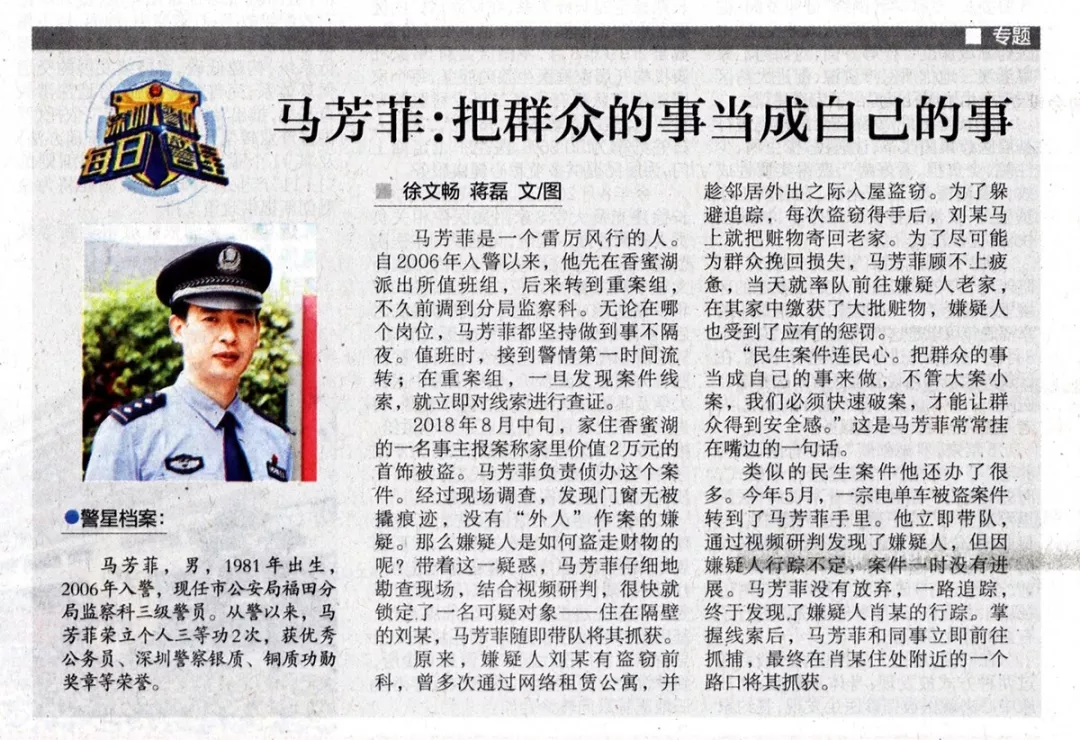 馬芳菲是一個雷厲風行的人。自2006年入警以來,他先在香蜜湖派出所值班組,后來轉到重案組,不久前調到分局監(jiān)察科。無論在哪個崗位,馬芳菲都堅持做到事不隔夜。值班時,接到警情第一時間流轉;在重案組,一旦發(fā)現案件線索,就立即對線索進行查證。