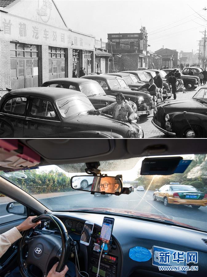 拼版照片:上圖為1965年,北京首都汽車公司職工在出租站擦洗汽車(新華社記者鄭震孫攝);下圖為2019年8月25日,北京新月聯(lián)合出租汽車公司司機穆懷東一邊運送乘客,一邊通過網(wǎng)約車手機平臺接收訂單信息(新華社記者張笑宇攝)。