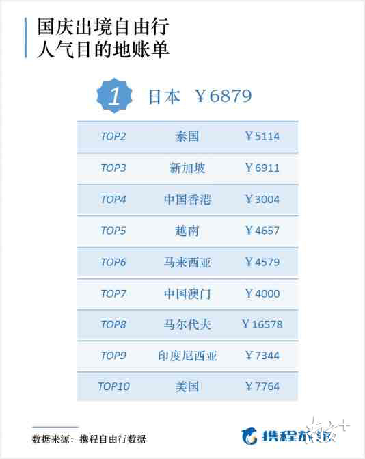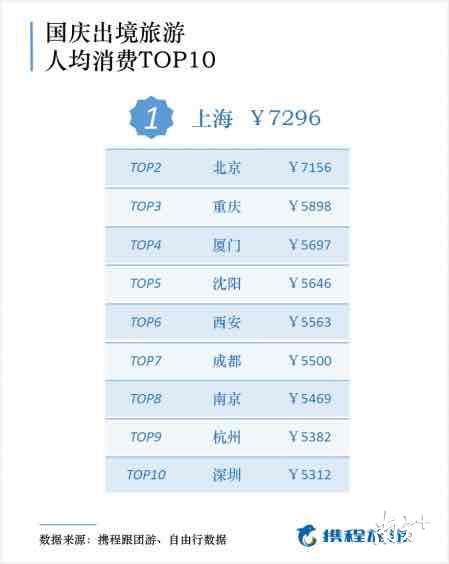 而國(guó)慶假期國(guó)人出境游花費(fèi)多少錢?據(jù)攜程出境游數(shù)據(jù)顯示,國(guó)慶通過攜程旅游平臺(tái)報(bào)名跟團(tuán)游、自由行、定制游等度假產(chǎn)品的人均花費(fèi)是國(guó)內(nèi)游價(jià)格的近2倍。出境游消費(fèi)力前十名出發(fā)城市為上海、北京、重慶、廈門、沈陽(yáng)、西安、成都、南京、杭州和深圳。上海和北京出境游人均花費(fèi)超過了7000元,遠(yuǎn)遠(yuǎn)超過了其他城市。