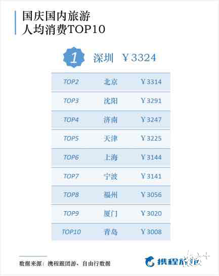 哪些城市居民的平均消費(fèi)最高?根據(jù)攜程跟團(tuán)游和自由行數(shù)據(jù),“國(guó)內(nèi)游消費(fèi)力前十強(qiáng)城市”依次為深圳、北京、沈陽(yáng)、濟(jì)南、天津、上海、寧波、福州、廈門和青島。這些城市國(guó)慶旅游單次國(guó)內(nèi)游人均花費(fèi)超過3000元,其中深圳人最舍得花錢,單次國(guó)內(nèi)旅游人均花費(fèi)達(dá)到了3324元。