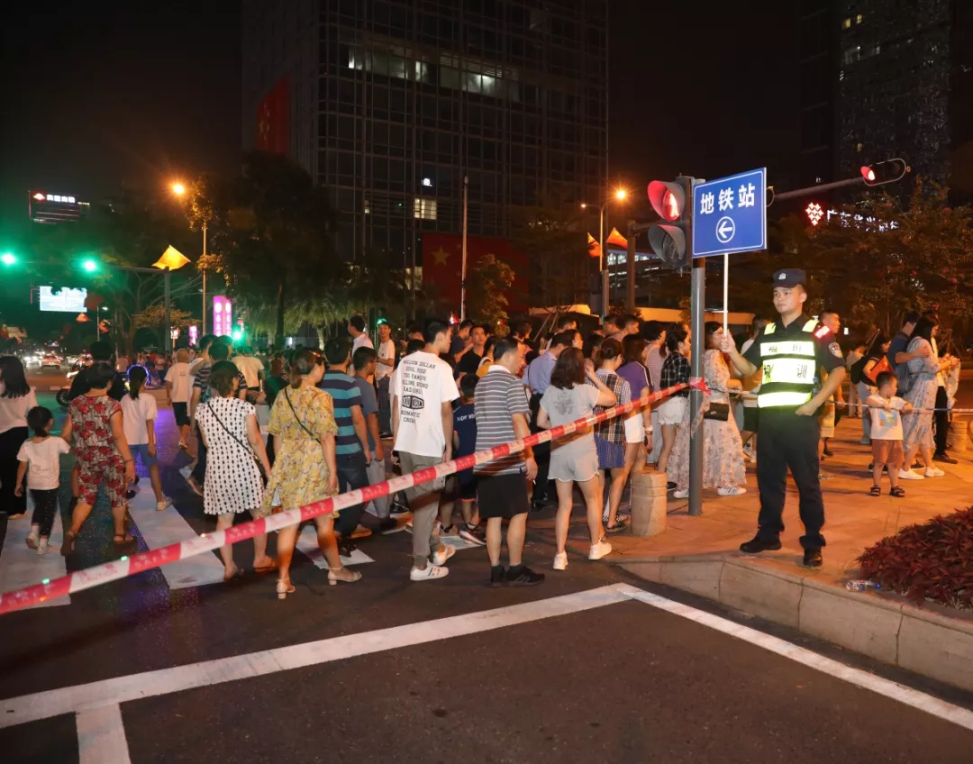 “同一個(gè)時(shí)間、同一個(gè)地點(diǎn),如何保證十幾萬(wàn)人看完燈光秀,安全、有序、祥和地離開(kāi),這不是一個(gè)簡(jiǎn)單的安保工作,是一個(gè)系統(tǒng)工程?!备L飬^(qū)副區(qū)長(zhǎng)、公安分局局長(zhǎng)江峰表示。本次燈光秀疏導(dǎo)工作在國(guó)慶節(jié)前已做了預(yù)案,警力每天下午五點(diǎn)半就全部上崗,保證所有的閘口人員就位,封控福中三路和深南大道輔道,利用隔離帶當(dāng)鐵馬,人流北進(jìn)南出。“我們通過(guò)在廣場(chǎng)各出入口及周邊路段,加裝地鐵、公交指示牌,全程指引疏導(dǎo)人群走向。對(duì)市民中心地鐵站六個(gè)出入口進(jìn)行單循環(huán)規(guī)劃,所有觀眾進(jìn)場(chǎng)都是單行線,這樣人群不會(huì)形成對(duì)沖,保證疏導(dǎo)有序進(jìn)行?!备L锕卜志指本珠L(zhǎng)譚慶彬介紹道。