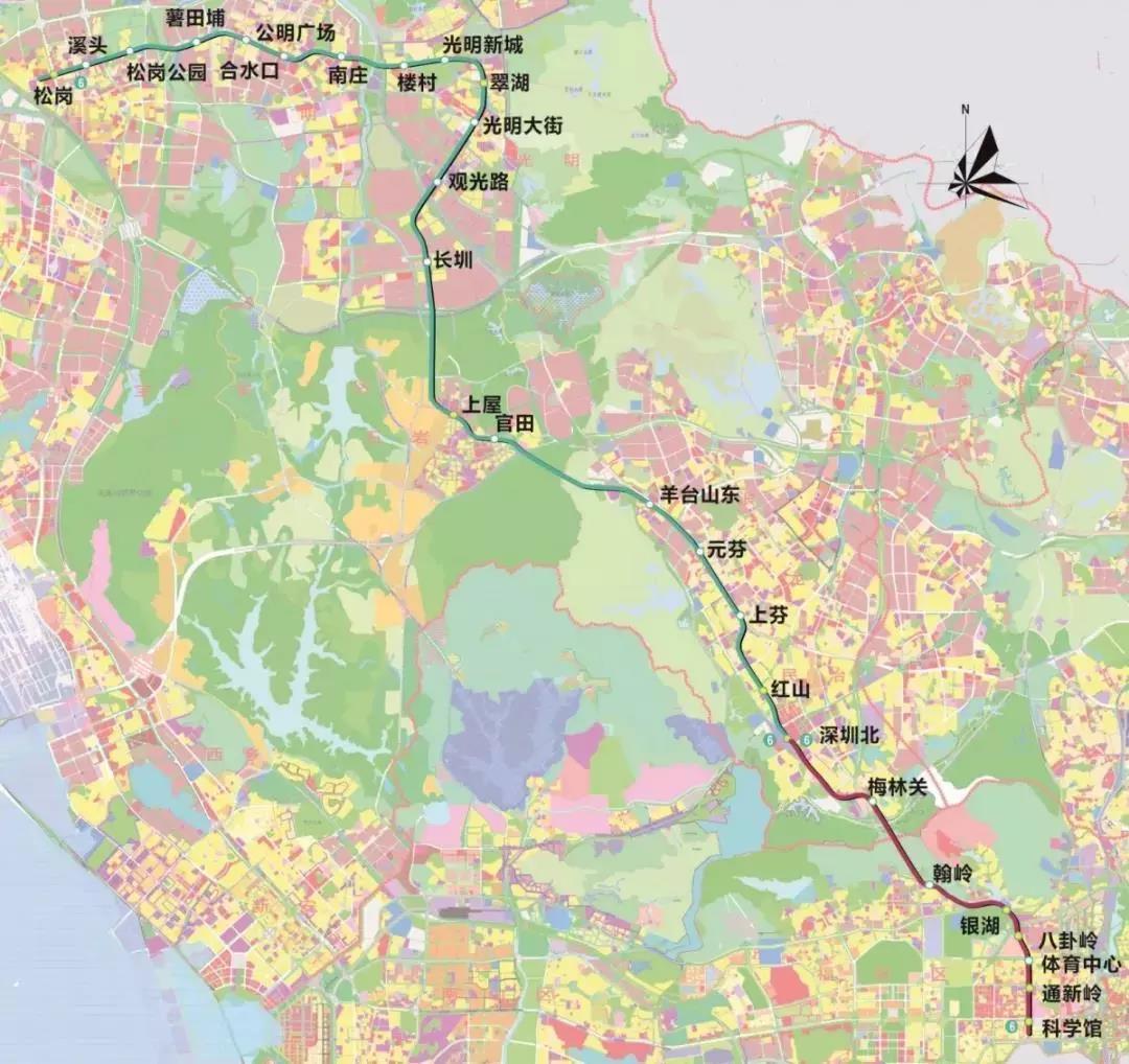 地鐵6號(hào)線分一、二期工程建設(shè),其中,一期線路起自深圳北站,終于松崗站,并與地鐵11號(hào)線換乘,連接龍華、大浪、石巖、光明、公明、松崗等片區(qū),線路全長(zhǎng)約37.6公里。共設(shè)車站20座,其中地下站5座、高架站15座、換乘站6座。