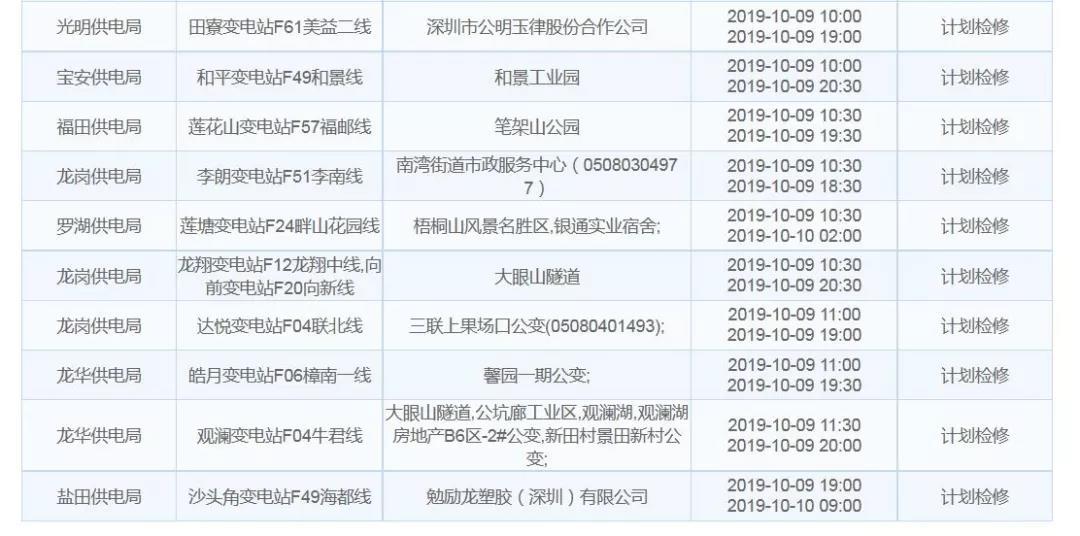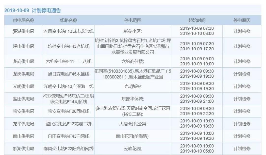10月9日計(jì)劃停電通告