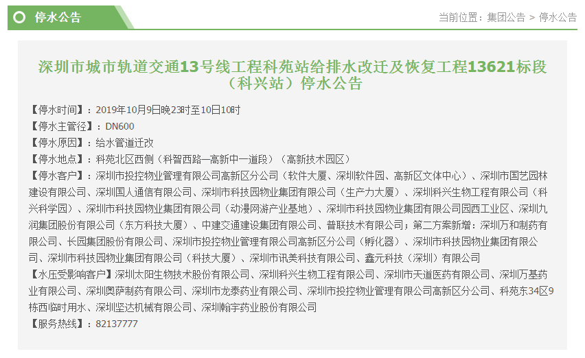 10月9日晚23時(shí)至10日10時(shí),因給水管道遷改,科苑北區(qū)西側(cè)將停水,停水客戶包括中建交通建設(shè)集團(tuán)有限公司、深圳市科技園物業(yè)集團(tuán)有限公司、深圳市迅美科技有限公司等多個(gè)企業(yè)。