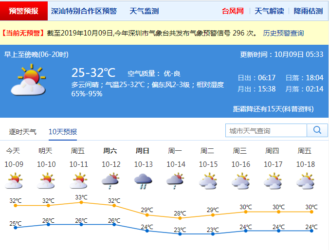 見圳客戶端·深圳新聞網(wǎng)2019年10月9日訊 據(jù)深圳市氣象局消息,9日,深圳多云間晴;氣溫25-32℃;偏東風(fēng)2-3級(jí);相對(duì)濕度65%-95%。