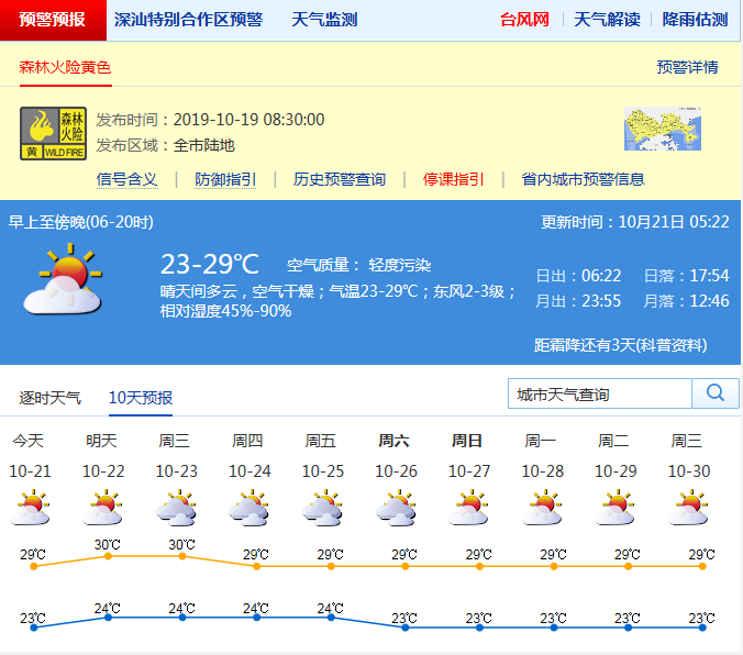 見圳客戶端·深圳新聞網(wǎng)2019年10月21日訊 深圳未來一周天氣較為穩(wěn)定,天氣持續(xù)干燥,預(yù)計21日晴天間多云,早晚能見度較差,有輕霧;氣溫23-29℃;東風(fēng)2-3級;相對濕度45%-90%。22日晴天間多云,早晚有輕霧;23-24日多云,偶有零星小雨,早晚有輕霧;25-27日晴天干燥。