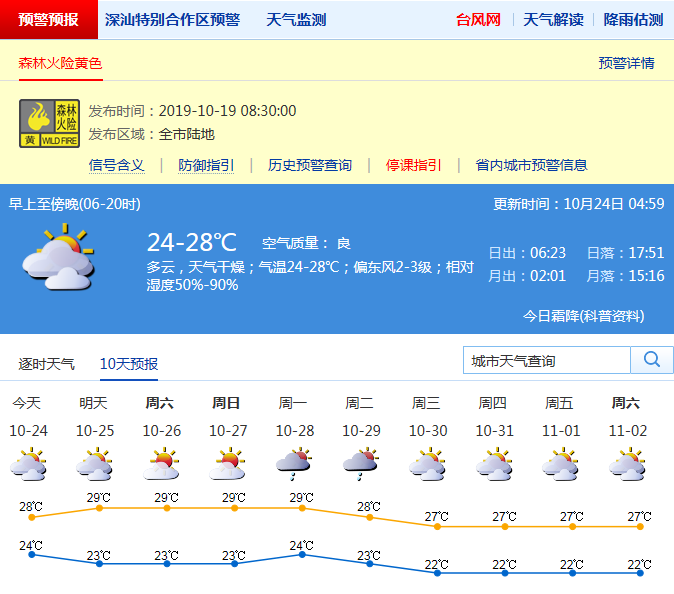 北方因為降溫,人們早已套上毛衣、穿起秋褲,深圳的小伙伴還在穿著夏裝。昨天白天,全市晴天間多云,早晚較清涼,最低氣溫21℃-23℃,最高氣溫29℃-30℃。全市森林火險黃色預(yù)警信號生效中。