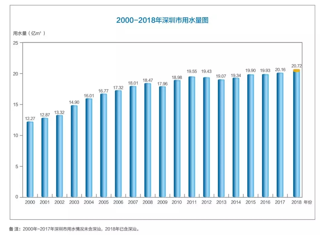 2000-2018年,深圳市用水量整體呈現(xiàn)遞增趨勢(shì)。2018年,深圳市(未含深汕合作區(qū))萬元GDP用水量8.41立方米,位列全國(guó)大城市前列。