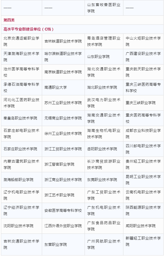 入圍“雙高計劃”的高職院校分為四類,其中第一類包括高水平學(xué)校建設(shè)單位(A檔)10所;第二類包括高水平學(xué)校建設(shè)單位(B檔)20所;第三類包括高水平學(xué)校建設(shè)單位(C檔)26所、高水平專業(yè)群建設(shè)單位(A檔)26所、高水平專業(yè)群建設(shè)單位(B檔)59所;第四類包括高水平專業(yè)群建設(shè)單位(C檔)56所。
