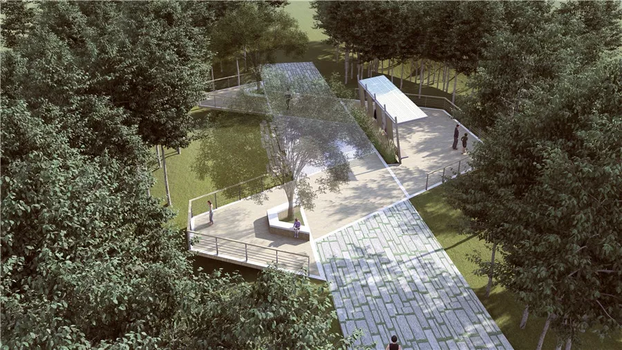 利用現(xiàn)狀平臺進(jìn)行改造提升,場地形式由“人”字演化而來,廊架也取自“人”形元素進(jìn)行設(shè)計,平臺北向俯瞰群賢廣場,南面則朝向求知花園,具有一攬眾英才之意。