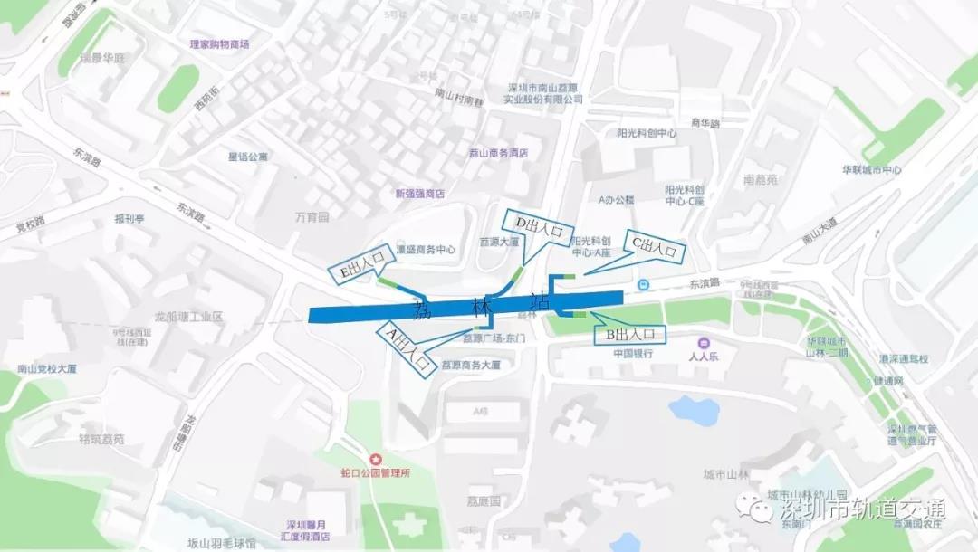 其中,A出入口位于荔園商務(wù)大廈北側(cè),B出入口位于城市山林廣場北側(cè),C出入口位于陽光科創(chuàng)南側(cè),D出入口位于荔源大廈東側(cè),E出入口位于濠盛商務(wù)中心南側(cè)。