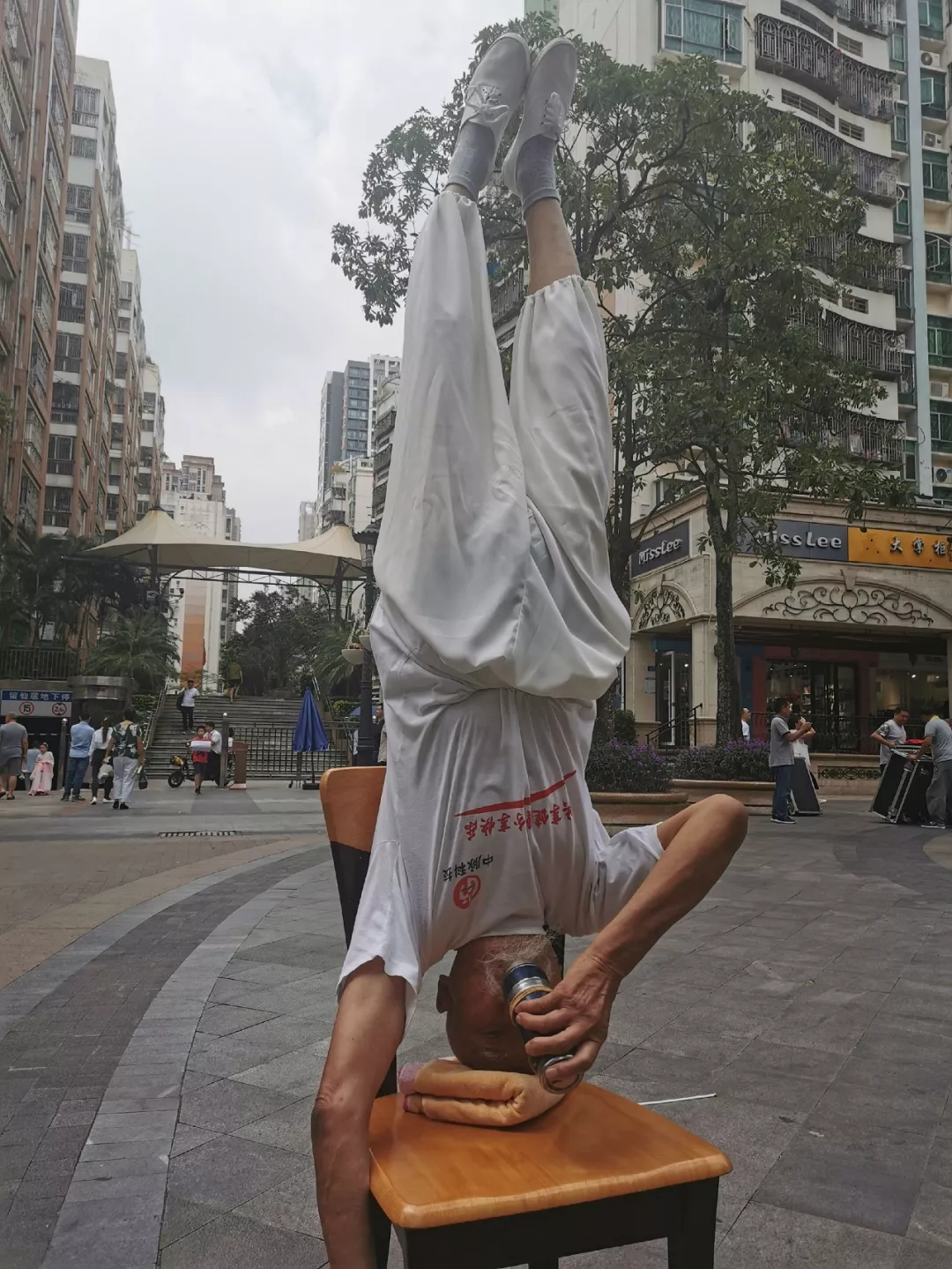 采訪當(dāng)日,記者正在調(diào)試相機(jī)的時(shí)候,忽聞?wù)坡曀钠?,原來魏宗信又在廣場(chǎng)上秀出拿手絕活“倒立”: