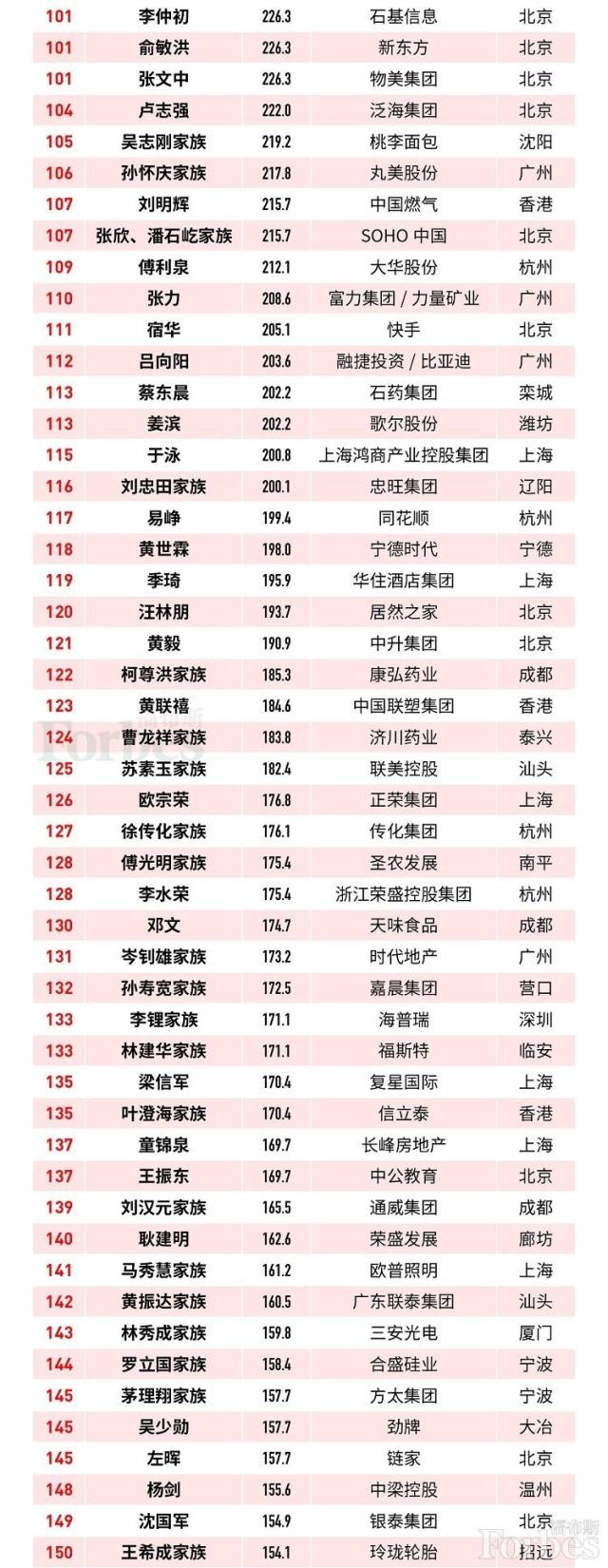 編制本榜單使用的持股和財(cái)務(wù)信息取自家族和個(gè)人、證交所、分析師和監(jiān)管機(jī)構(gòu)。資產(chǎn)計(jì)算使用的是截至10月25日的股價(jià)和匯率。非上市公司的估值基于對(duì)同類(lèi)上市公司的分析評(píng)估。被抵押股權(quán)予以折價(jià)計(jì)算。與福布斯全球億萬(wàn)富豪榜不同,福布斯中國(guó)富豪榜包括參與配偶生意的夫婦。一些估算還包括其他家族成員擁有的資產(chǎn)。