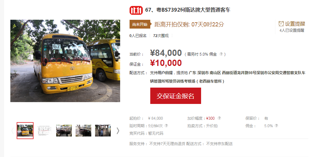 競買人應于拍賣會前在京東拍賣平臺進行實名登記注冊,注冊成功后請按京東拍賣平臺的提示進行操作;競買人在對拍賣標的物首次確認出價競拍前,按系統(tǒng)提示報名繳納10000元/輛的保證金;在競價過程中,請競買人按規(guī)定的加價幅度300元出價,若自行出價,請仔細核對好出價金額,若出現(xiàn)出價金額錯誤的情況,由買受人自行承擔后果;拍賣成交后,買受人請于拍賣成交之時起72小時內(nèi)全額支付拍賣成交價款、拍賣傭金、增值稅及附加、機動車轉(zhuǎn)移登記車牌費,并到廣東華士德(深圳)拍賣行有限公司所在地(深圳市羅湖區(qū)中興路219號華興酒店4樓)簽署《拍賣成交確認書》及辦理相關(guān)手續(xù)。