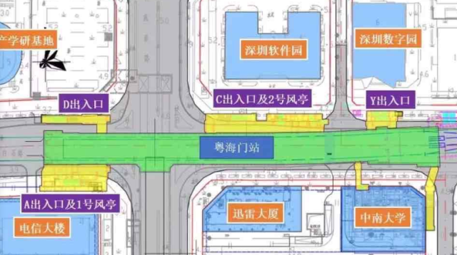 粵海門站位于白石路與科苑南路交叉口處,車站出入口共計4個,其中A出入口位于電信大樓旁,D出入口位于深港產學研基地旁,C、Y出入口位于白石路北側,靠近深圳軟件園及數(shù)字園。