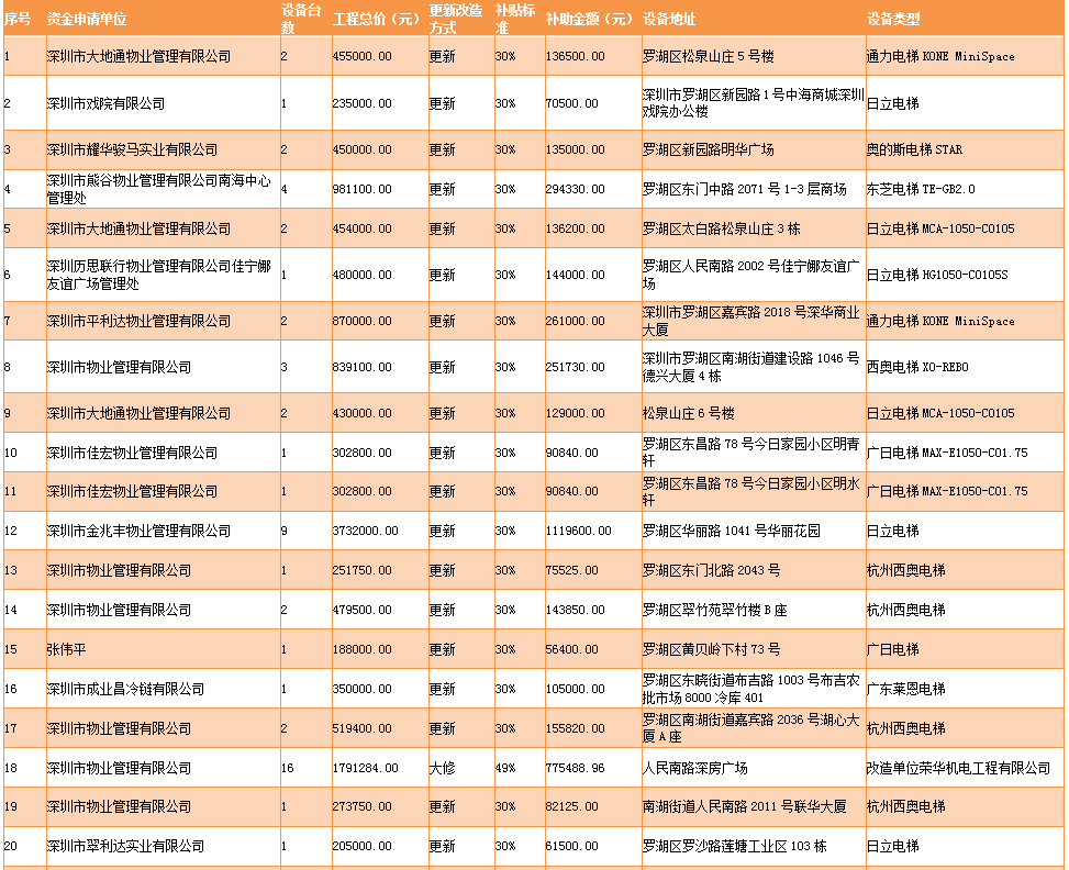 見圳客戶端·深圳新聞網(wǎng)2019年11月15日訊 11月13日,深圳市市場(chǎng)監(jiān)督管理局羅湖監(jiān)管局發(fā)布關(guān)于2019年羅湖區(qū)老舊電梯更新改造大修補(bǔ)助名單的公示,公示稱,為推進(jìn)羅湖區(qū)老舊電梯更新改造大修工作,保障市民群眾生命安全,羅湖區(qū)施行老舊電梯更新改造大修補(bǔ)助政策。2019年,經(jīng)專家現(xiàn)場(chǎng)驗(yàn)收,羅湖區(qū)共有41家申請(qǐng)單位的112臺(tái)老舊電梯更新改造大修工程通過驗(yàn)收(其中更新84臺(tái)、改造12臺(tái),大修16臺(tái)),涉及工程總價(jià)3084.57萬元,發(fā)放補(bǔ)助資金9640009.05元。