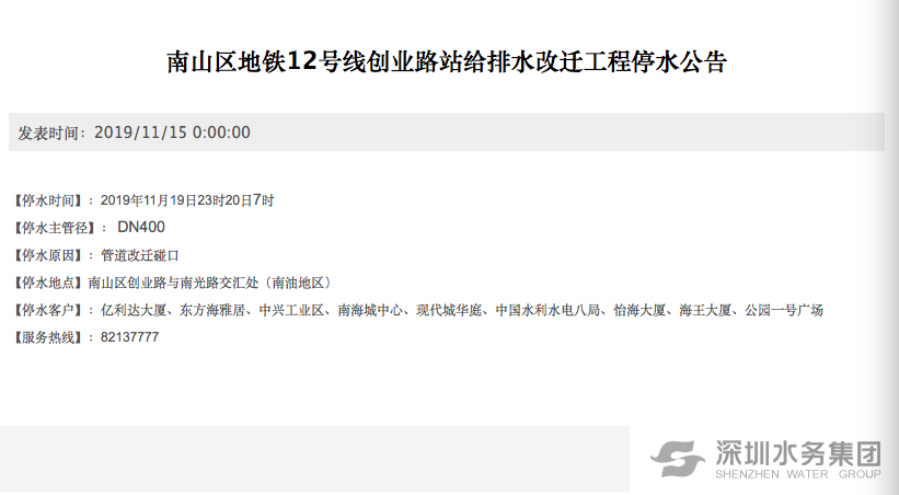 為配合南山區(qū)地鐵12號線創(chuàng)業(yè)路站給排水改遷工程,深圳水務(wù)集團(tuán)計(jì)劃于11月19日23時(shí)20日7時(shí),對南山區(qū)創(chuàng)業(yè)路與南光路交匯處DN400供水管道進(jìn)行改遷碰口,屆時(shí)南油地區(qū)暫停供水。具體影響用戶為:億利達(dá)大廈、東方海雅居、中興工業(yè)區(qū)、南海城中心、現(xiàn)代城華庭、中國水利水電八局、怡海大廈、海王大廈、公園一號廣場。