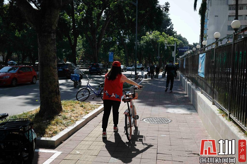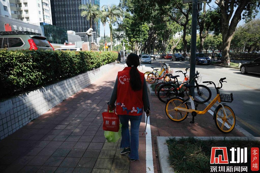 2019年11月22日,福田區(qū),一位義工正在將路邊的共享單車(chē)擺放整齊。