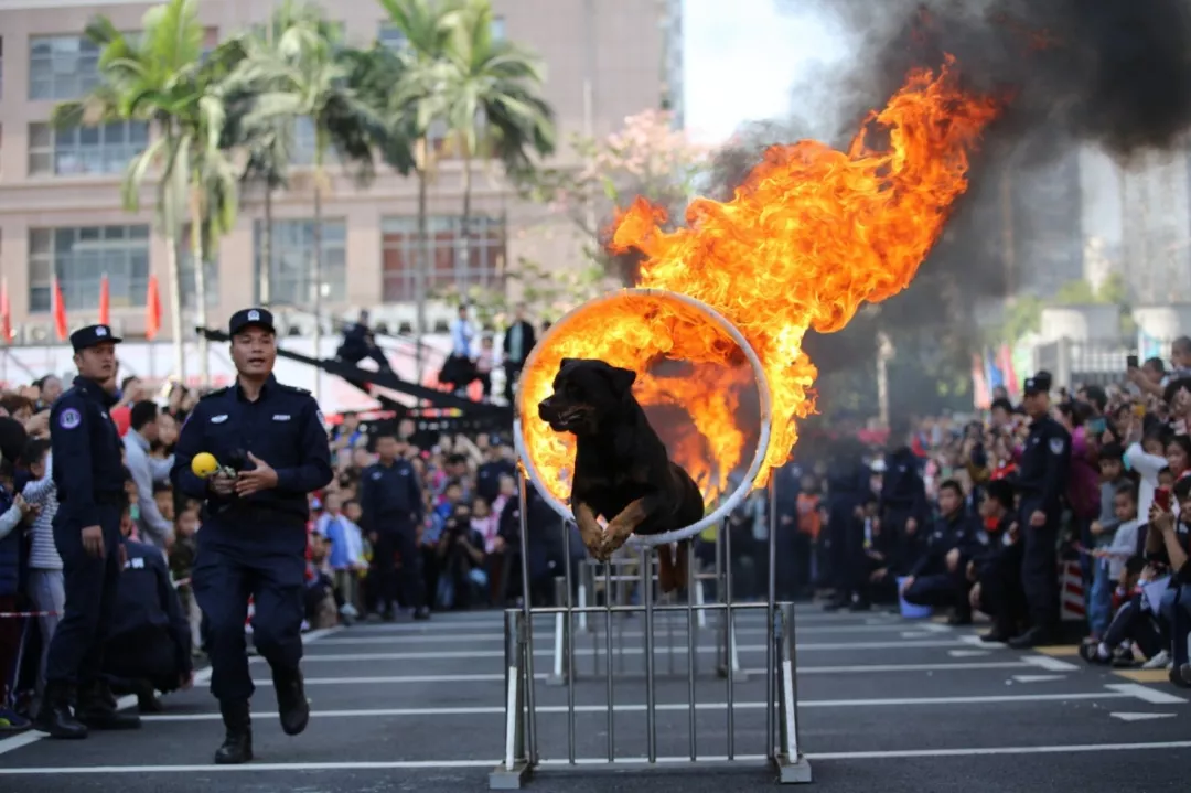 實戰(zhàn)撲咬、解救人質(zhì)、跳火圈……警犬強悍威猛、敏銳靈動,成為了比武展示活動上的焦點。拳術表演動作利落瀟灑,孔武有力,展現(xiàn)著福田警察的精神風貌,市民朋友贊嘆不已。