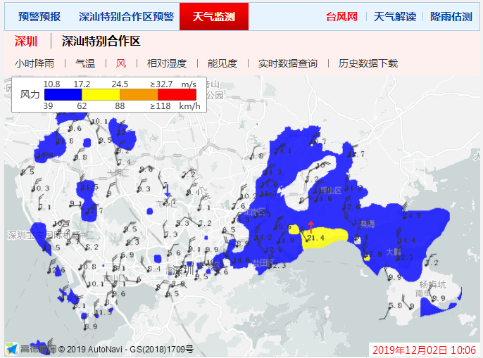 從實時的風力圖上可以看到,龍崗區(qū)、坪山區(qū)、鹽田區(qū)、大鵬新區(qū)大部風力在10.8m/s至17.2m/s,更有部分區(qū)域風力達黃色預警。