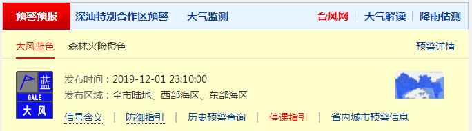 深圳市氣象臺于12月1日23時10分在全市發(fā)布大風藍色預警,預計平均風力將達6級以上(或陣風8級以上),目前大風藍色預警持續(xù),今天東北風4-5級,沿海、高地和海區(qū)陣風7-8級。
