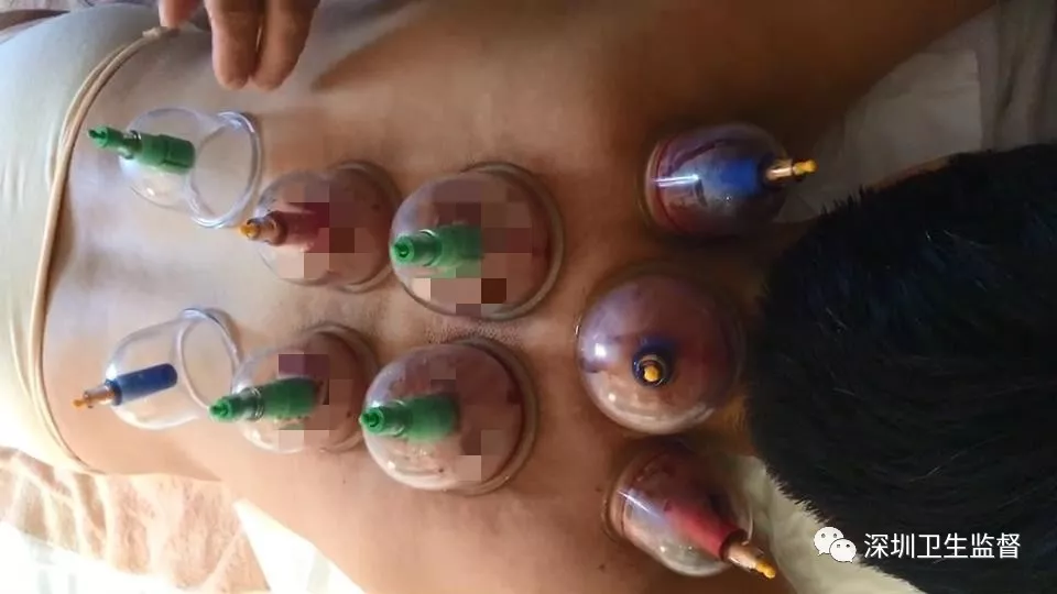 接受按摩治療的女子背后,吸了7個(gè)罐子,可與其它普通拔罐不同的是,每個(gè)罐子里,竟然都有血珠不斷溢出……