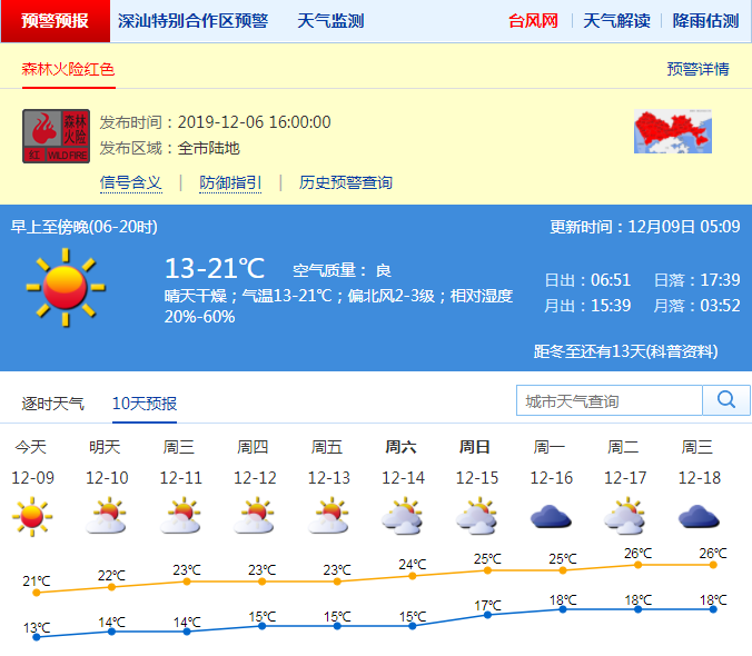 見(jiàn)圳客戶端·深圳新聞網(wǎng)2019年12月9日訊 連日來(lái)的降溫,讓許多市民懷疑“深圳難道入冬啦?”周末早晨,全市最低氣溫只有10-12℃??諝夥浅8稍?,深圳市森林火險(xiǎn)紅色預(yù)警、深汕區(qū)森林火險(xiǎn)黃色預(yù)警及寒冷黃色預(yù)警信號(hào)生效中。