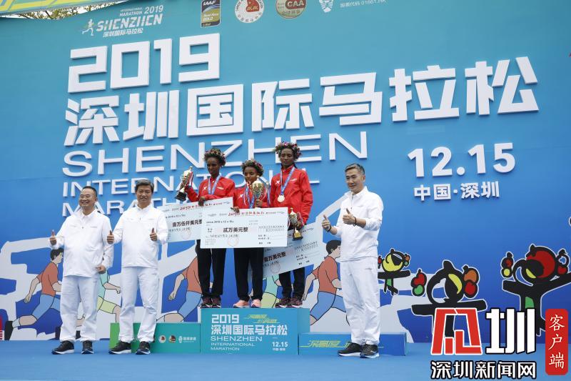 女子半程馬拉松前三名選手合影留念。