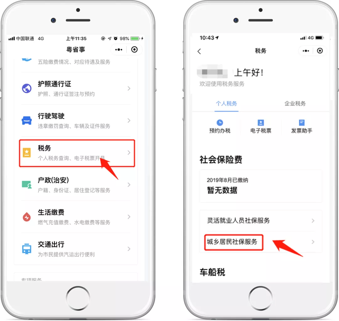 在“粵省事”小程序首頁點(diǎn)擊“稅務(wù)”服務(wù),在“個人稅務(wù)”板塊找到“社會保險費(fèi)”—“城鄉(xiāng)居民社保服務(wù)”(暫不支持深圳地區(qū))。