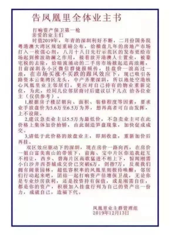 近日,福海街道中糧鳳凰里花苑小區(qū)個(gè)別業(yè)主發(fā)布集體漲價(jià)言論,涉嫌惡意炒作二手房價(jià),以下為網(wǎng)傳業(yè)主倡議書