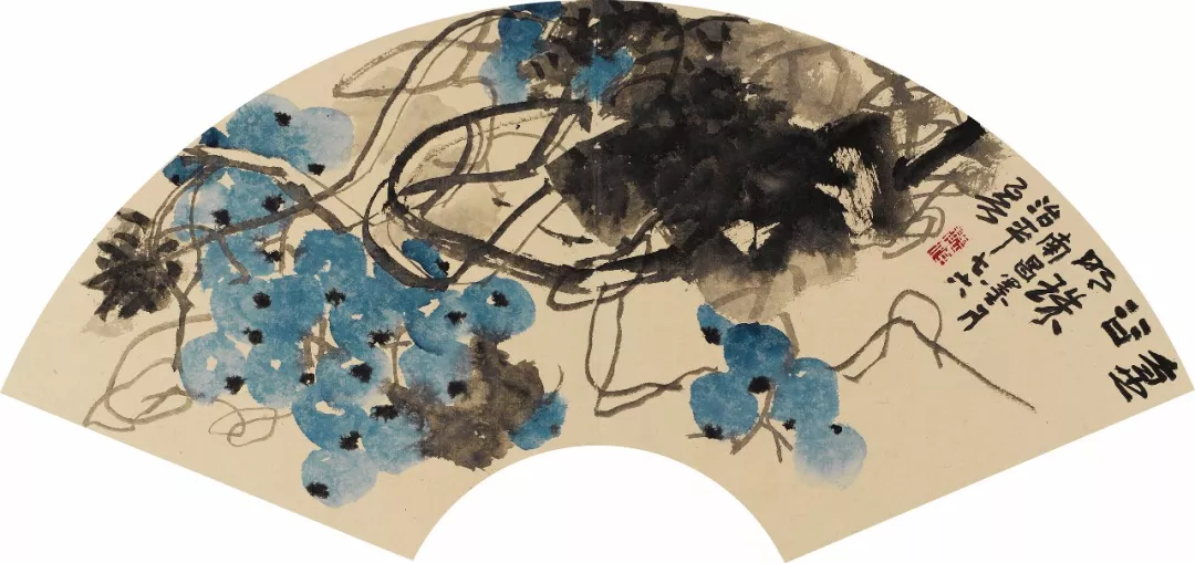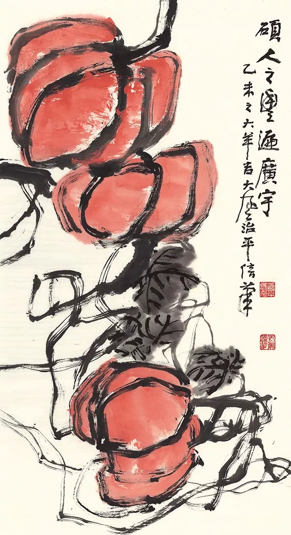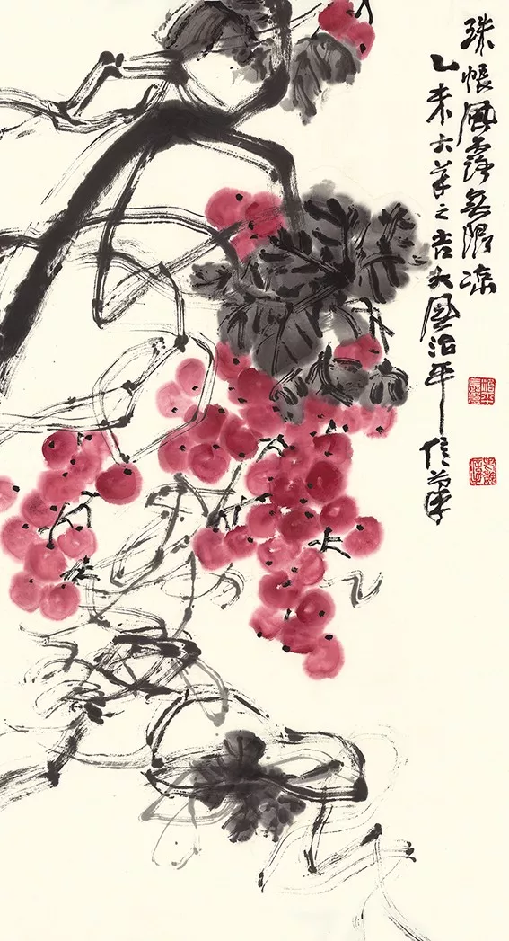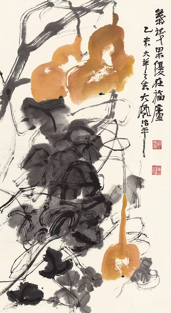 魏治平的畫,尤以藤類見長(zhǎng),構(gòu)圖奇異,筆酣墨飽,瓜果菜蔬鳥蟲魚,無一不獨(dú)出心裁,氣象崢嶸,水墨淋漓之間極富創(chuàng)作精神,他筆下的南瓜、紫藤、凌霄、葡萄等更有齊白石、吳昌碩之風(fēng),自成一派,奔放不離法度,神微孕育氣魄。