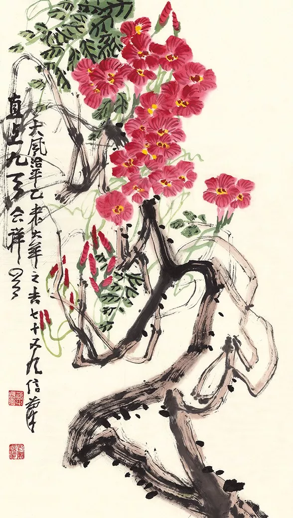 魏治平的藝術(shù)貴于創(chuàng)造,以書法入畫,畫中常見有篆書筆意。三十年前長(zhǎng)江日?qǐng)?bào)總編海洋先生,曾提筆寫下《魏瘋子傳奇》,洋洋灑灑八千言,一時(shí)間荊楚大地震動(dòng)。西泠印社理事朱妙根稱其“方寸之間有靈山,紅花墨葉又一派”。西泠印社執(zhí)行社長(zhǎng)、中國(guó)印學(xué)博物館館長(zhǎng)劉江先生為其第一本書畫作品集題簽書名。美國(guó)前總統(tǒng)老布什收有魏老書法作品“龍蛇競(jìng)走舞長(zhǎng)空、點(diǎn)染梅花分外紅。且賦新詩(shī)遙寄意,長(zhǎng)江密水兩相通”。印第安納州州立大學(xué)博物館大廳懸掛的便是魏老八尺紅梅詩(shī)書畫中堂。
