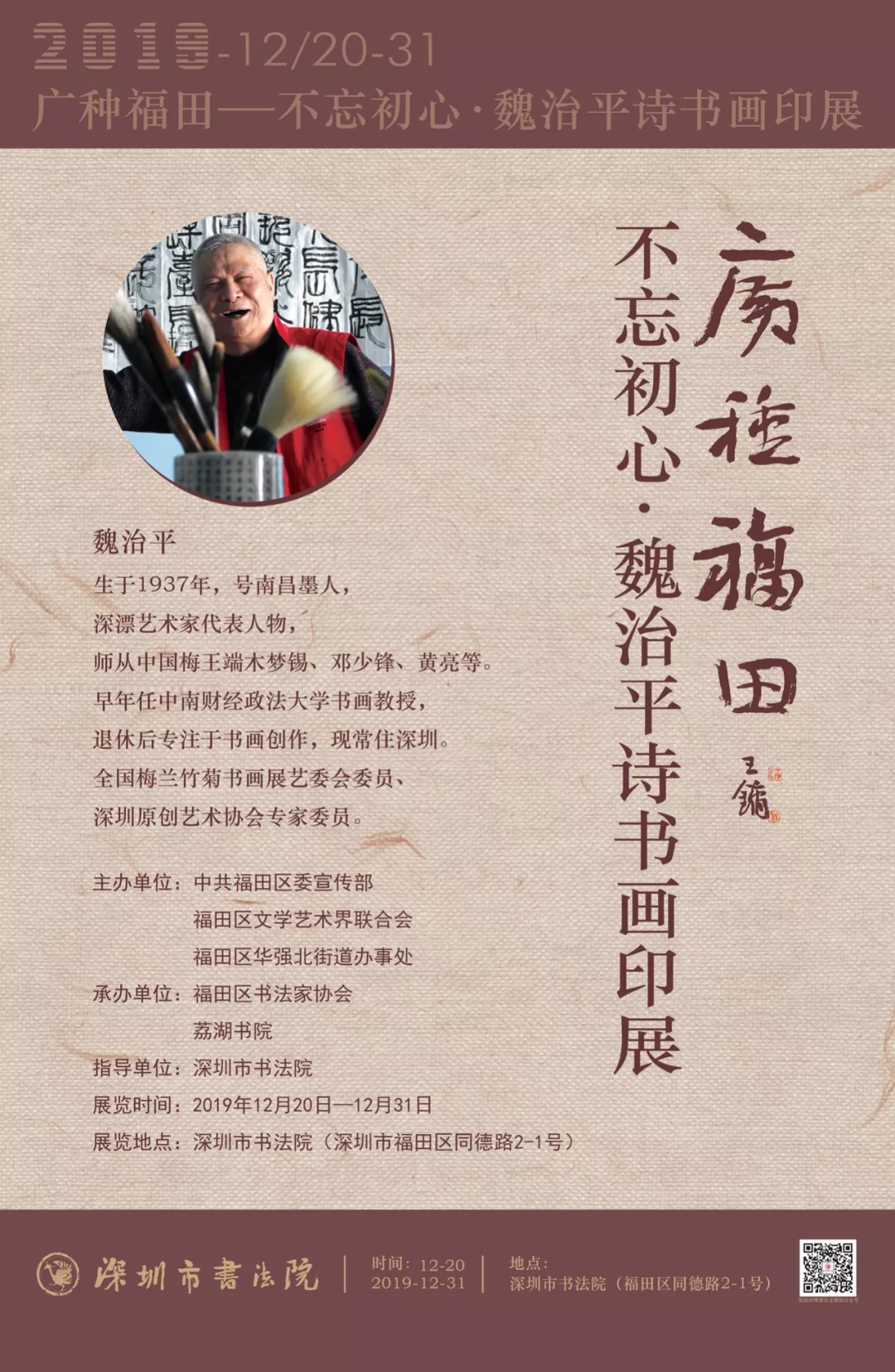 12月20日至12月31日,“廣種福田不忘初心——魏治平詩(shī)書畫印展”在深圳市書法院展出。年過八十的魏治平,仍筆耕不輟,堅(jiān)持攀登藝術(shù)高峰,不斷創(chuàng)作。本次展覽除了展出他多年創(chuàng)作的詩(shī)書畫印精品,還會(huì)展出他今年的最近佳作。